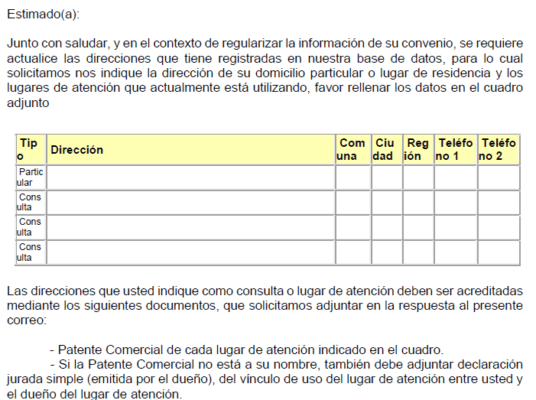 Formulario para actualizar datos para ser presentado ante Fonasa.